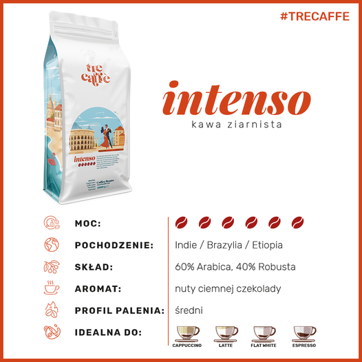 Intenso to kawa, która nie zwalnia tempa. W większych pakietach – 10, 15 lub 20 kg – doskonale sprawdzi się w biurach, hotelach, lokalach gastronomicznych czy punktach sprzedaży kawy. Jej intensywny charakter zadowoli nawet najbardziej wymagających miłośników espresso.